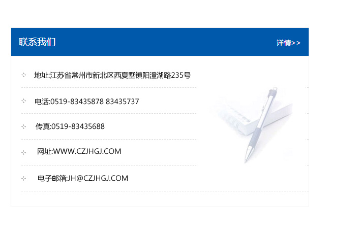 地址:常州市新北區友邦商務大廈1幢16、17層  電話:0519-85101652  傳真:0519-85112595  郵編:213022  網址:www.cz-jiayue_cn.bjhhgg.com  郵箱:xiajifengaa@163.com